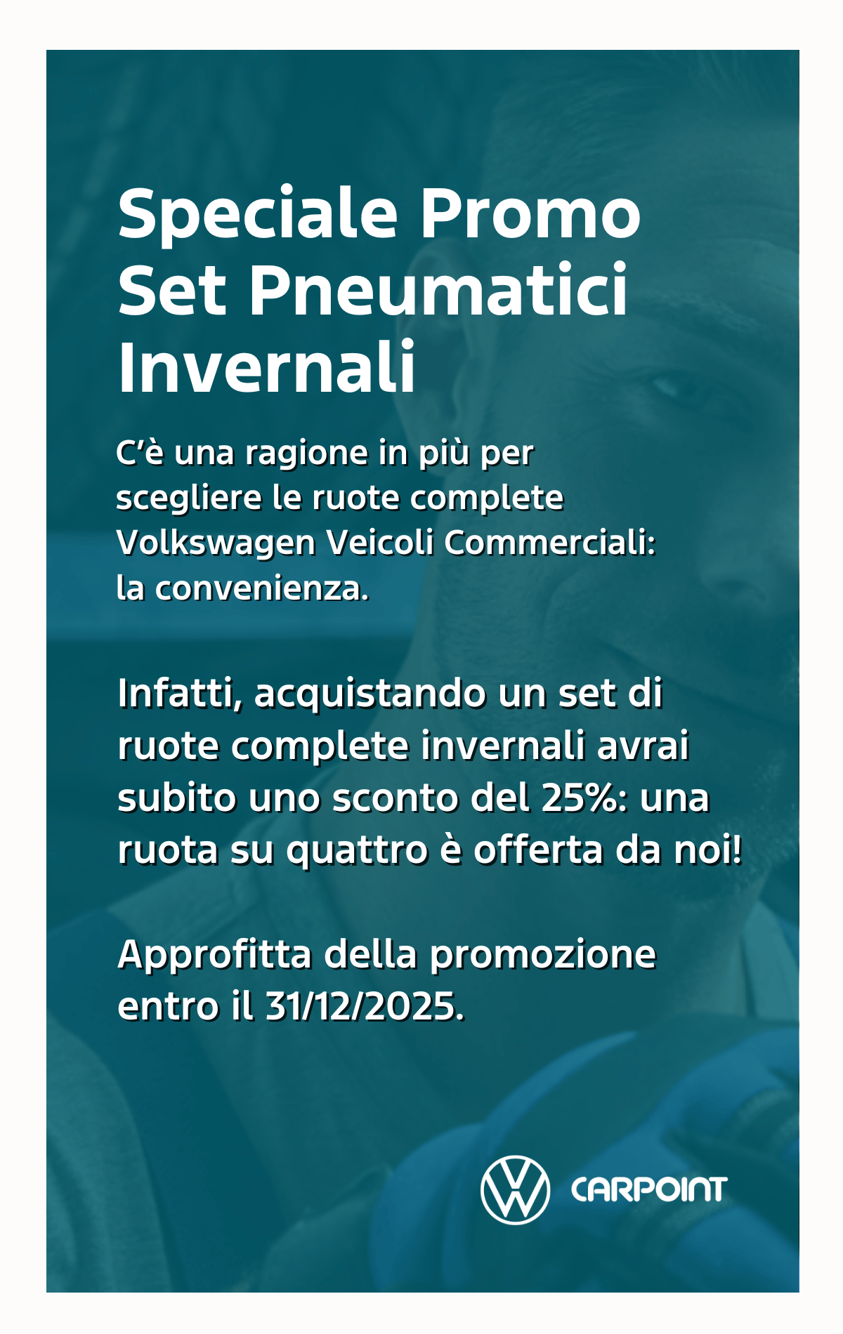 > 1 su 4 te la offriamo noi. Acquistando un set di ruote complete invernali, una su quattro la offriamo noi. Subito il 25% di sconto, senza compromessi sulla qualità e con tutta la tranquillità che solo ruote originali Volkswagen sanno garantire.