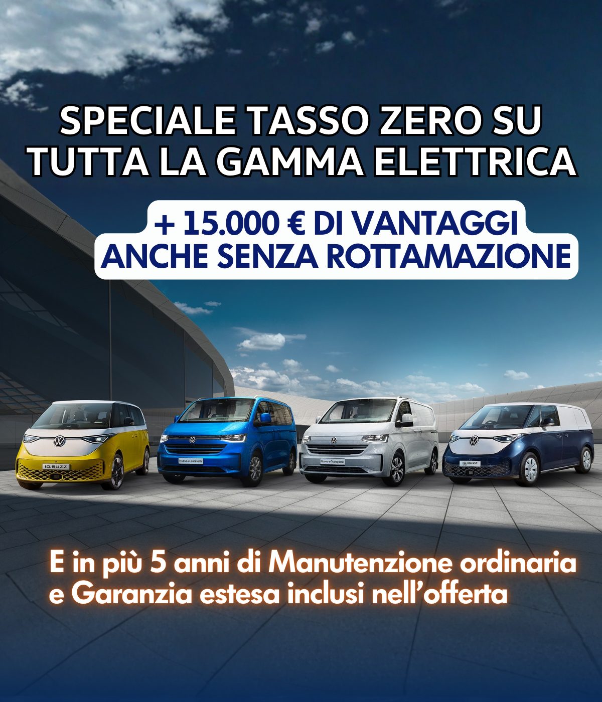 Approfitta di 15.000€ di ecoincentivi Volkswagen Veicoli Commerciali per l’acquisto di un veicolo elettrico della gamma.